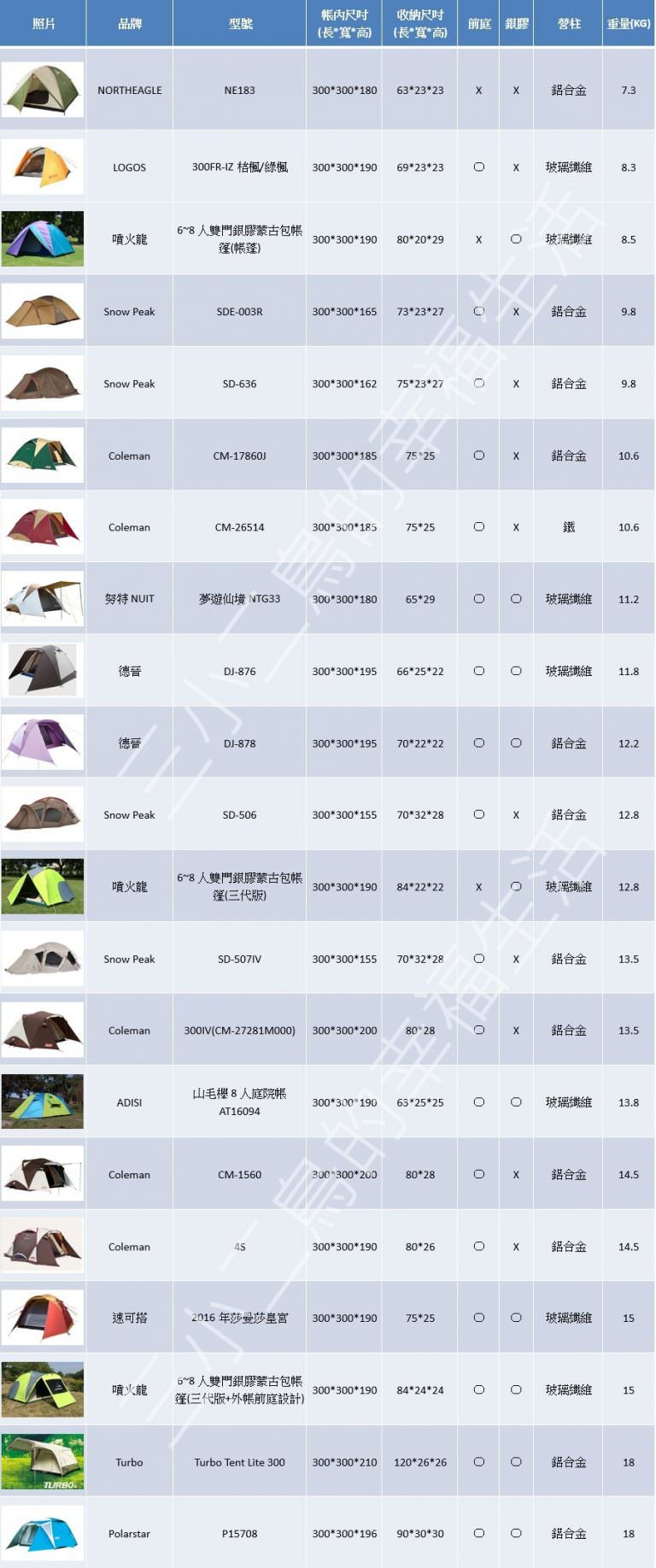 露營裝備|挑選300*300標準帳的21款規格表