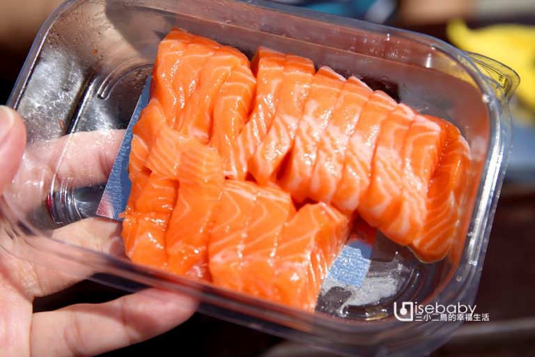 我們買了3盒100g的高山鮭魚生魚片,同時會一併提供芥末和醬油。