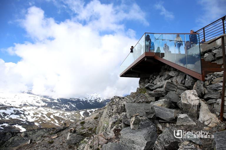 步道最後一段有階梯,看到玻璃護欄就表示已走到Dalsnibba觀景台,透過玻璃直接看見天空、完全無遮蔽的設計風格,也就好像與自然奇景融為一體,展現挪威愛好自然的理念。