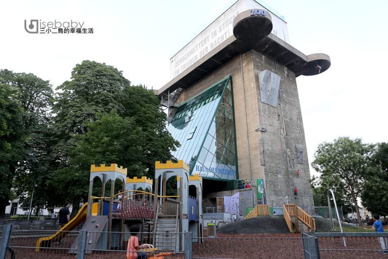 另外公園旁就是Kletteranlage Flakturm攀岩場,我們邊看顧三小邊看人家攀岩,尤其是照片右上角的那位,挑戰登上最上面的平台,可是捏了我們好幾把冷汗,不過很可惜試了好幾次,最後體力用盡只好放棄沒有成功登頂,這也太難了吧!