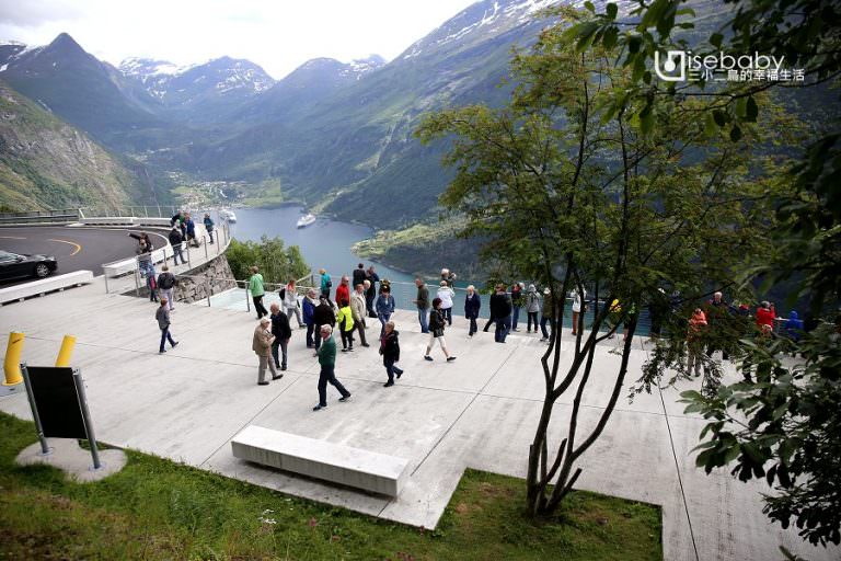 蓋在即將往下的老鷹之路髮夾彎旁、深入Geiranger蓋倫格峽灣的水泥平台,左邊就是挪威最知名的挪威縮影城市Geiranger蓋倫格,右邊則能盡覽Geirangerfjord蓋倫格峽灣美景,那直接垂直上升水平面的綿延山脈,以及那有故事的The Seven Sisters七姐妹瀑布。