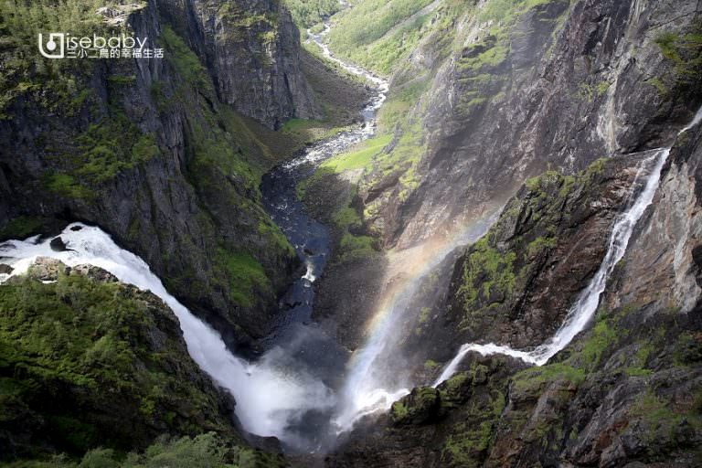走到步道底的觀景台,Vøringfossen瀑布的雙瀑布就完整的呈現在我們眼前!!!還看到陽光下閃耀的彩虹,太幸運了!